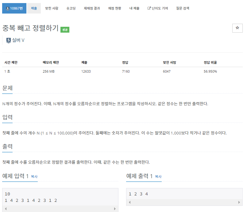 10867번: 중복 빼고 정렬하기