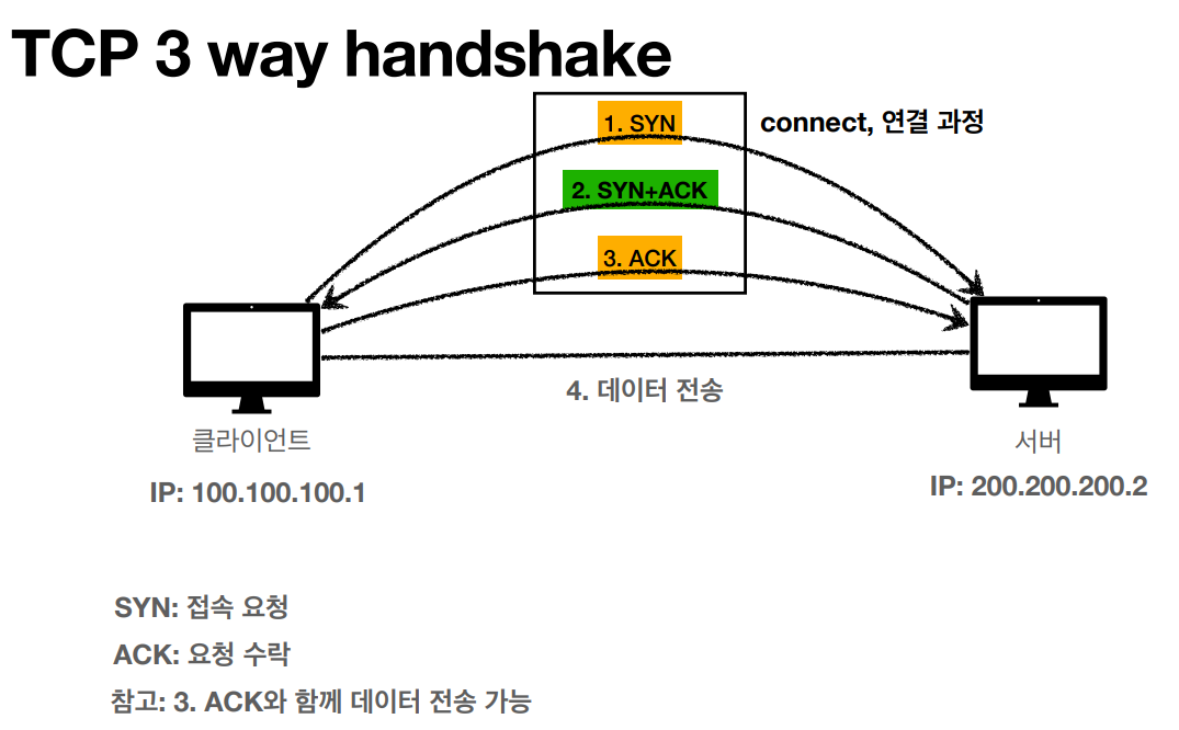 - 연결 지향 - TCP 3 way handshake(가상연결)