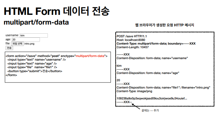 다른 종류의 여러 파일과 폼의 내용을 함께 전송이 가능하다.