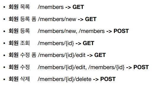강사님은 위의 예시에서 회원 등록폼은 /members/new -> GET, /members/new -> POST 이렇게 같은 꼴로 만드는 게 유지보수에 유리하다고 했다. 나 역시도 왠지 그게 편할 것 같기도...