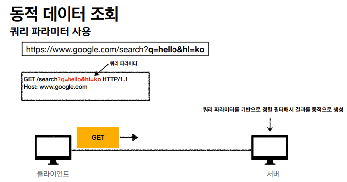 조회는 GET을 사용한다. GET이기에, 쿼리 파라미터를 사용해서 데이터를 전달한다.