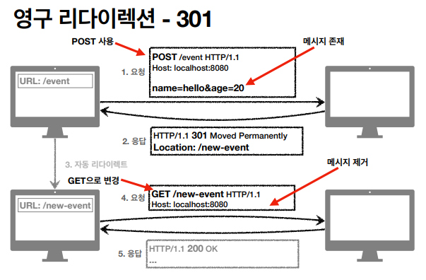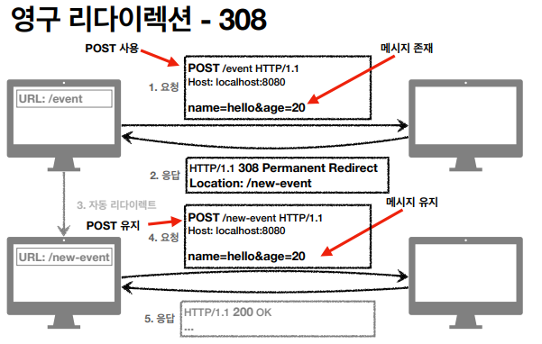 리다이렉트시 요청 메서드가 GET으로 변하고, 본문이 제거될 수 있음. - 308 Permanent Redirect