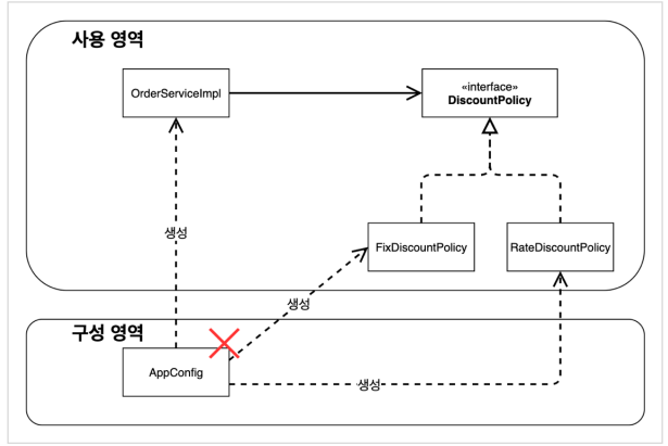 그렇기에 누군가가 클라이언트인 OrderServiceImpl에 DiscountPolicy의 구현체를 대신 생성하고 주입해줘야한다.