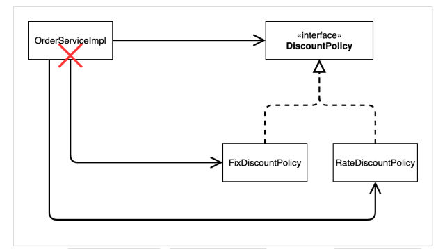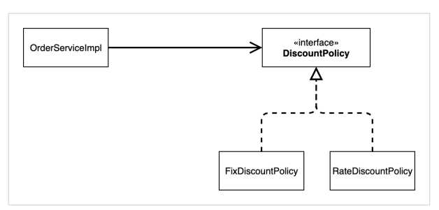 DiscountPolicy 인터페이스 뿐만이 아니라 FixDiscountPolicy라는 구현 클래스에도 의존하고 있는 것이다.
