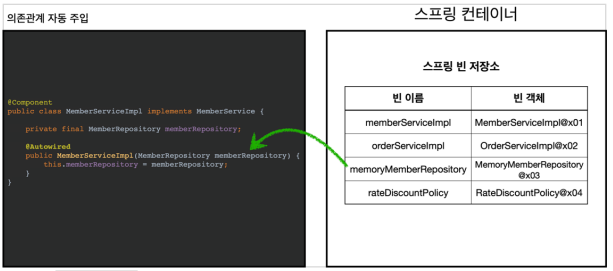 생성자에 @Autowired를 지정하면, 스프링 컨테이너가 자동으로 해당 스프링 빈을 찾아서 주입한다.