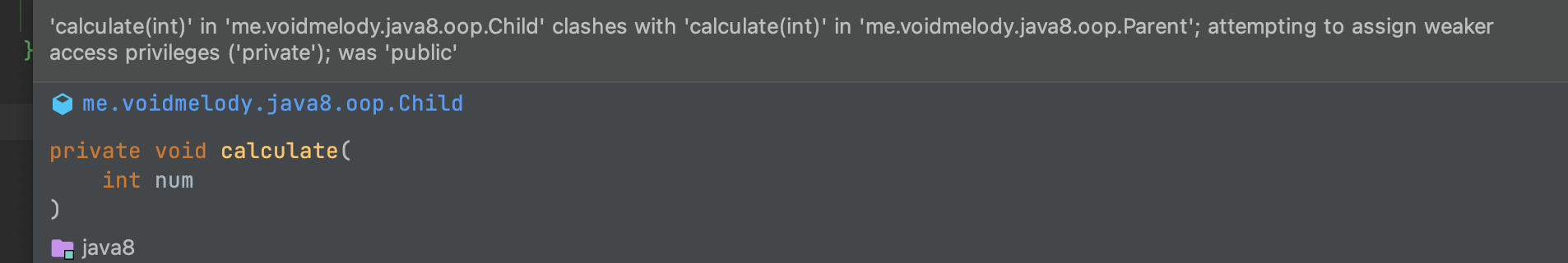 자식 클래스가 부모 클래스의 함수를 오버라이딩하면서, 이를 private로 변경했다 가정해보자. 어떻게 될까??