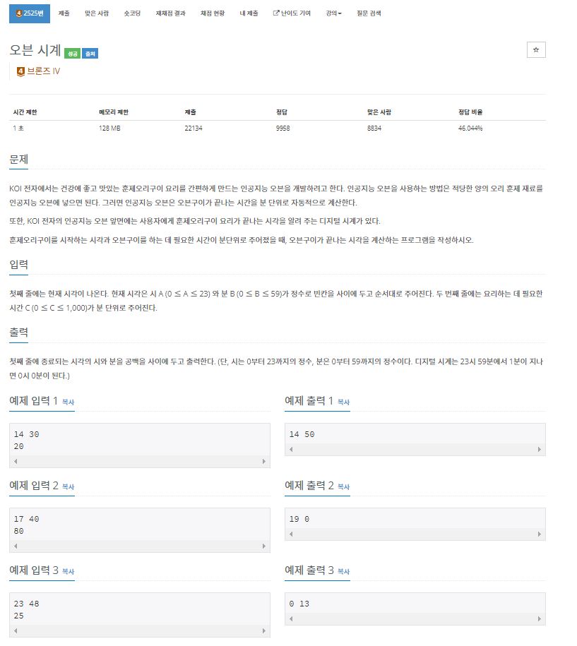 첫째 줄에 종료되는 시각의 시와 분을 공백을 사이에 두고 출력한다. (단, 시는 0부터 23까지의 정수, 분은 0부터 59까지의 정수이다. 디지털 시계는 23시 59분에서 1분이 지나면 0시 0분이 된다.)