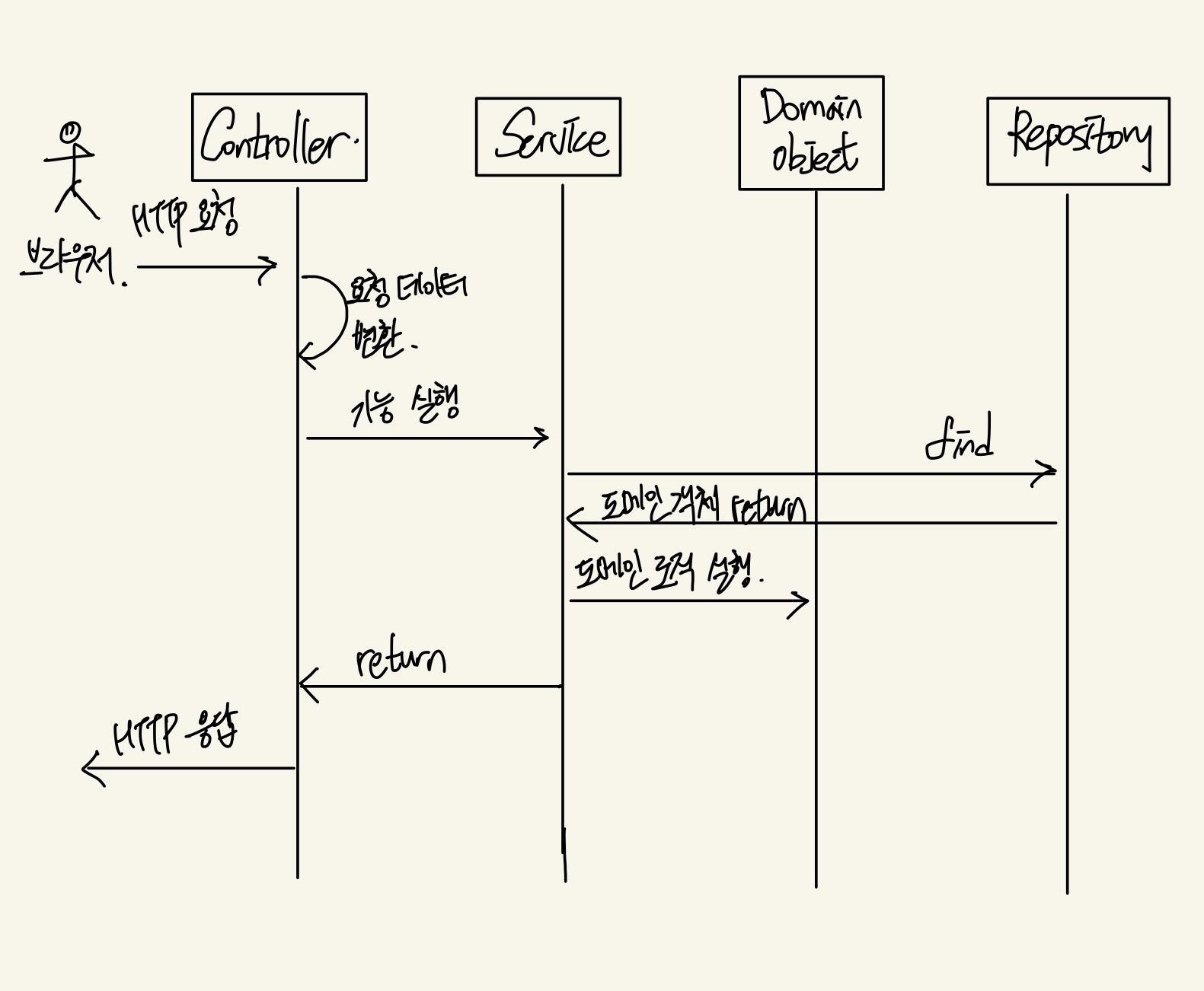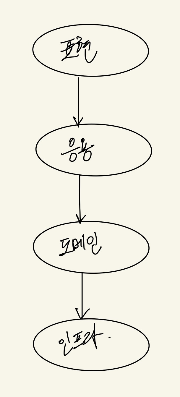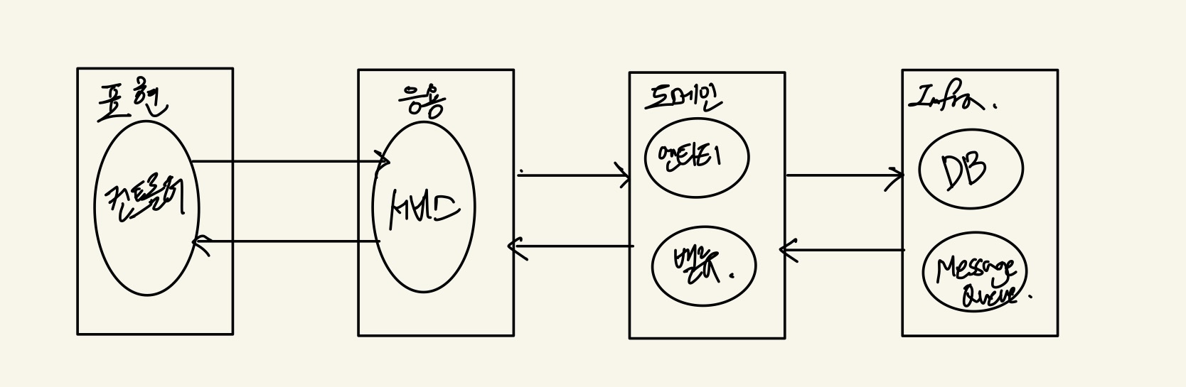 - 응용 : 사용자에게 제공할 기능 구현. 로직을 직접 수행하기 보다는 도메인 모델에 로직 수행 책임 위임