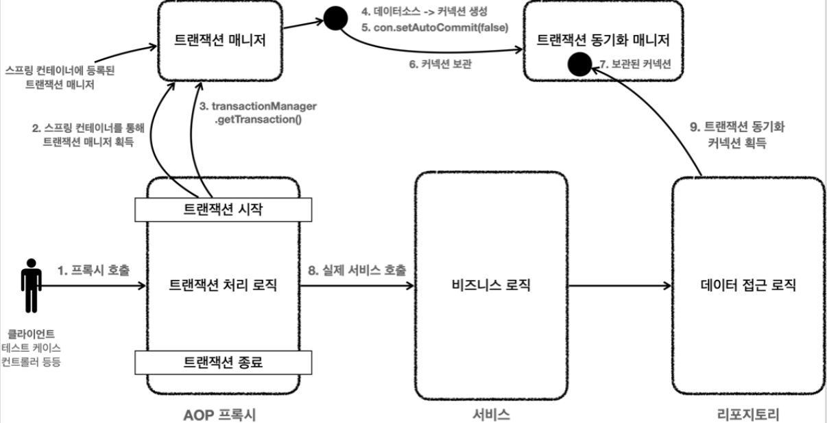 프록시에서 transaction을 가져와서, 프록시가 가리키는 실제 대상에 로직을 호출하고 commit하거나 rollback을 처리해준다.