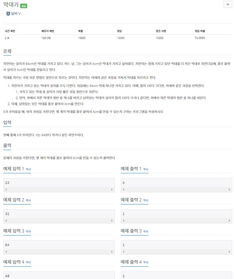 지민이는 길이가 64cm인 막대를 가지고 있다. 어느 날, 그는 길이가 Xcm인 막대가 가지고 싶어졌다. 지민이는 원래 가지고 있던 막대를 더 작은 막대로 자른다음에, 풀로 붙여서 길이가 Xcm인 막대