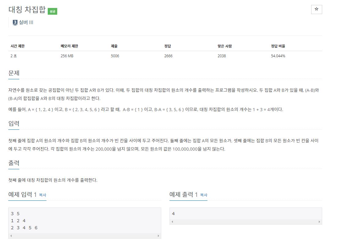 첫째 줄에 집합 A의 원소의 개수와 집합 B의 원소의 개수가 빈 칸을 사이에 두고 주어진다. 둘째 줄에는 집합 A의 모든 원소가, 셋째 줄에는 집합 B의 모든 원소가 빈 칸을 사이에 두고 각각 주어