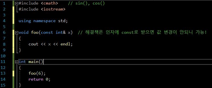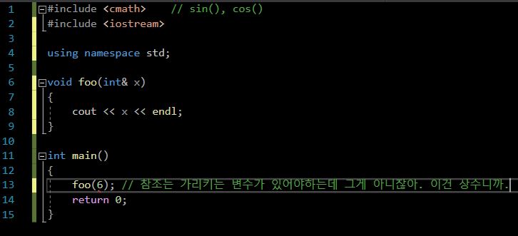 int& x = 5; 이건 틀린 문법이다. 참조는 말 그대로 다른 변수의 별명이라고 우리는 약속했다.