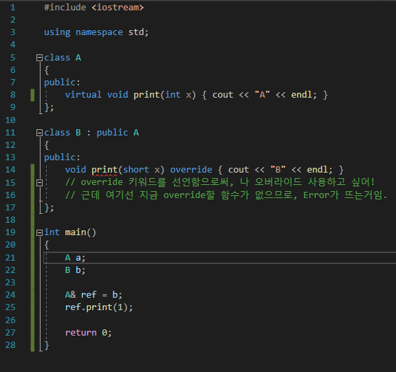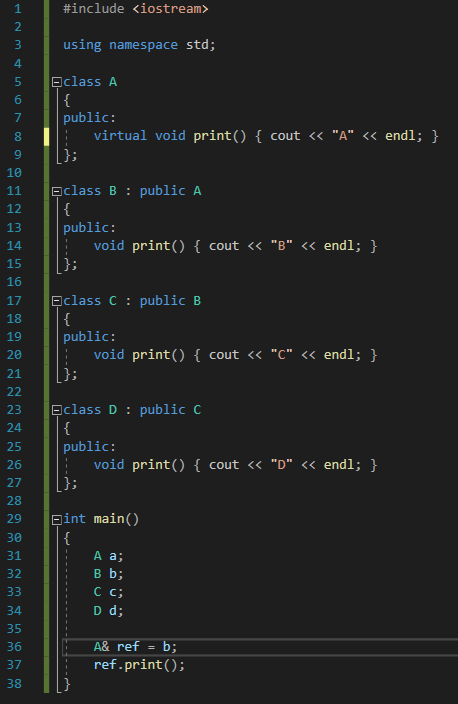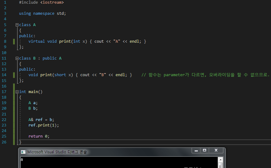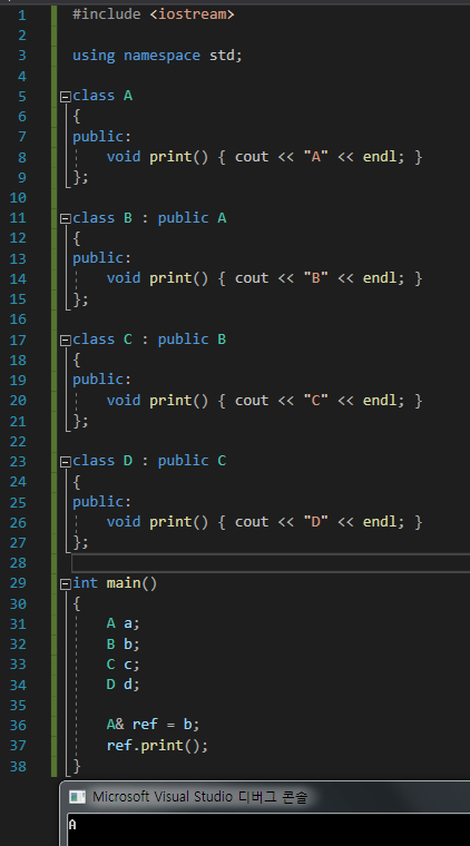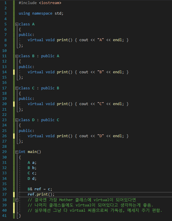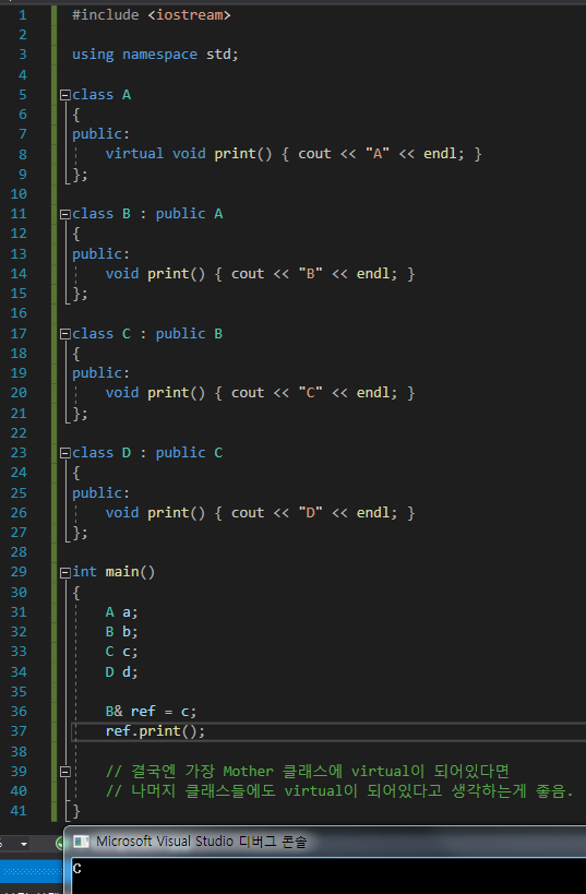 우리가 원하는 건, B가 프린트되는 것이기에, A의 함수에 virtual을 선언함으로써, B의 print()함수가 나올 수 있게 되었다.
