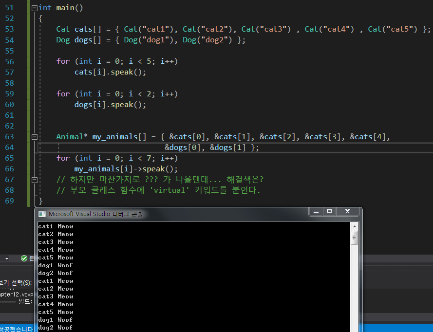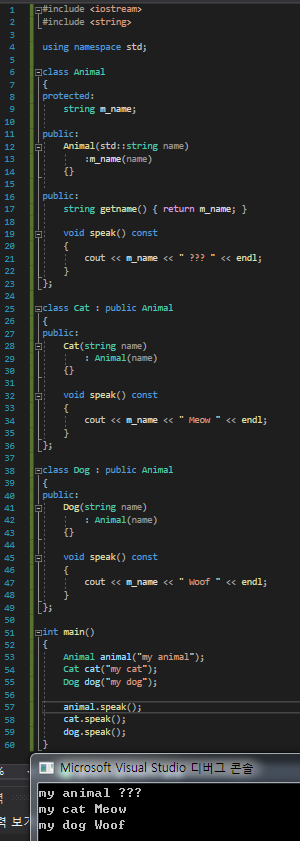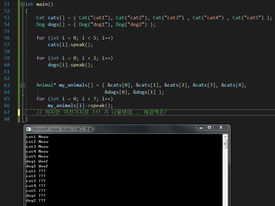 각자의 클래스에 speak()함수를 구현했기에, 각자에 맞게 호출되는 모습이다.