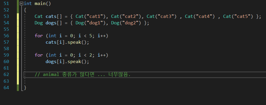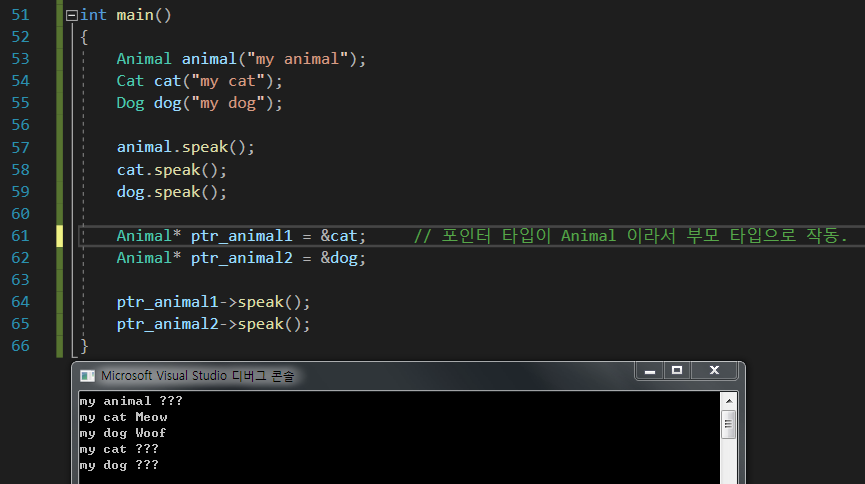 Animal* ptr_animal1 = &cat;을 한다면, 자료형 자체는 Animal*이기 때문에, Animal클래스로 해석해버려서