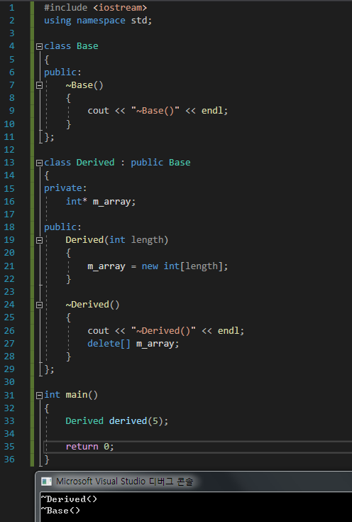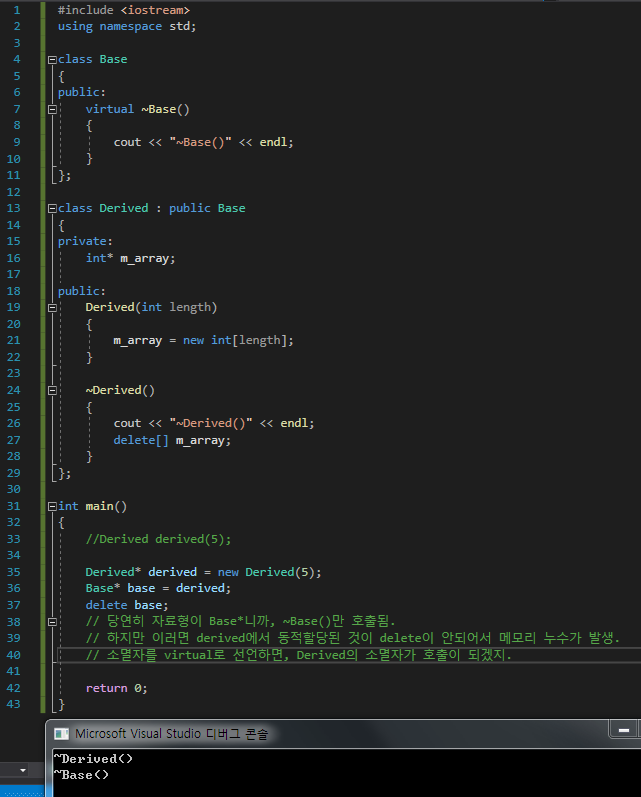 만약 이러한 코드라면? 자료형이 Base*이므로, Base의 소멸자만 호출되고 종료된다.