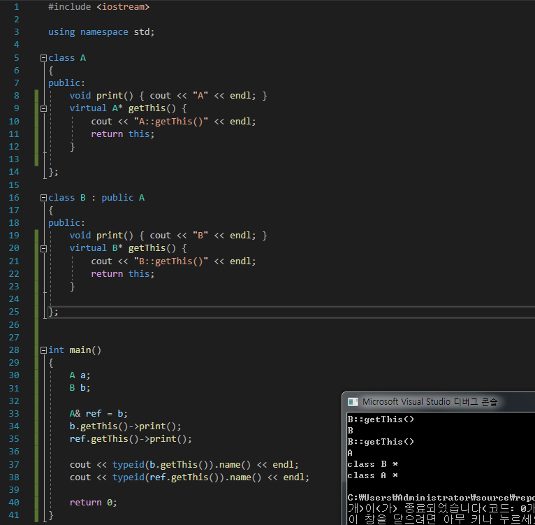 자료형이 A이니 오버라이딩을 안했다면 A* getThis()로 가야하지만, B* getThis()로 갔다.(단, 둘다 virtual을 선언했으니 오버라이딩이 된거임.)