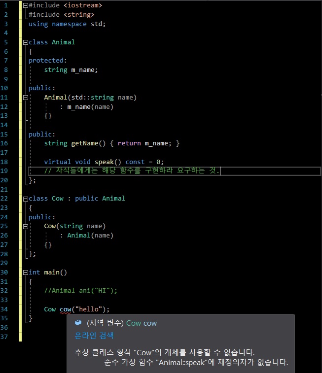 자식 클래스에서 해당 virtual 함수를 구현하지 않았기에, 자식 클래스의 객체를 만들 수 없다.