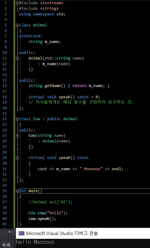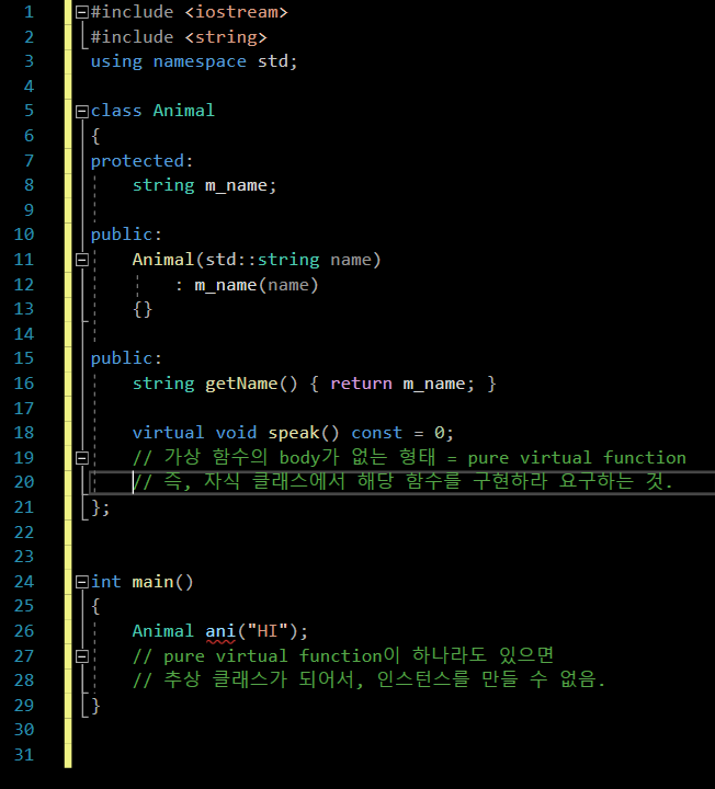 부모 클래스에 가상 함수를 body가 없는 상태로 선언만 해놓은 형태를 pure virtual function이라 한다.