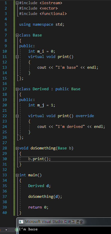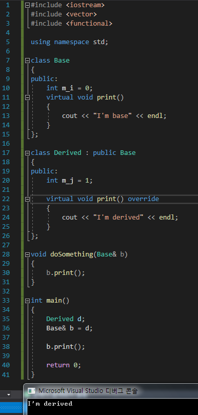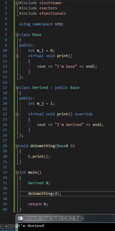 doSomething 함수를 보면 얘도 인자로 엄연히 reference로 받고 있기 때문에, Derived에 맞게 출력된다.