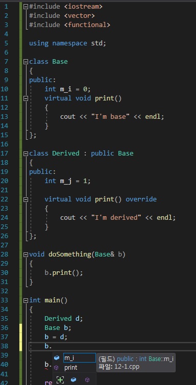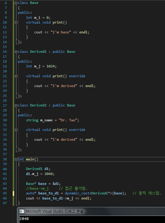 방법은, 임시로 Base* base를 Derived1* 로 바꾸면 되는 것이다.