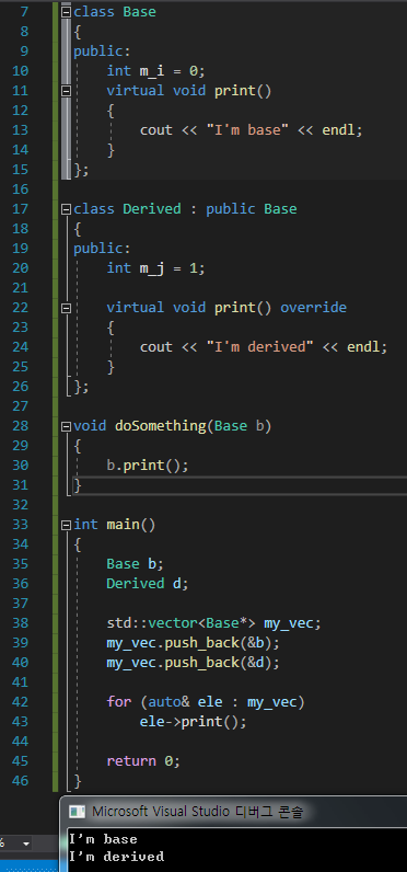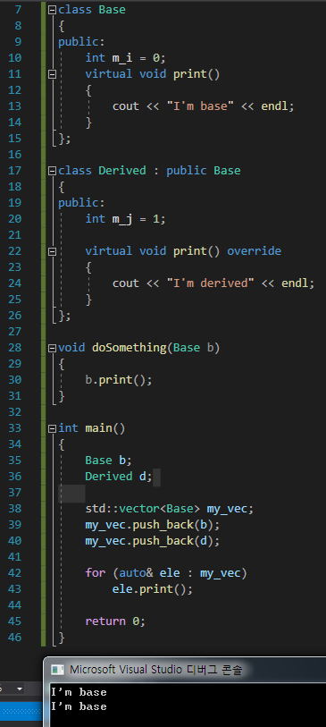그렇기에 단순히 vector<Base>로 할 경우 아까처럼 value로 처리되기 때문에 잘림현상이 발생한다.