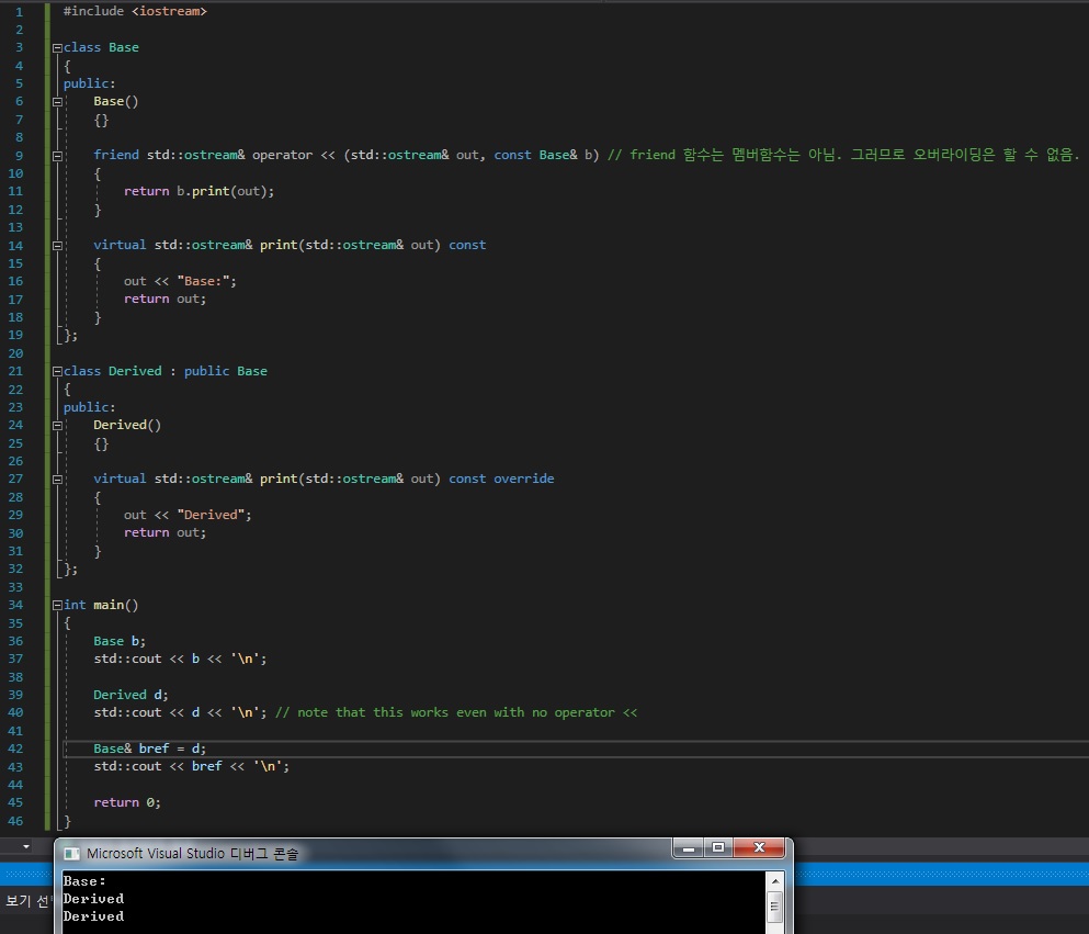 reference로 받아들였으니, 정상적으로 derived의 객체로 출력되고 있다.