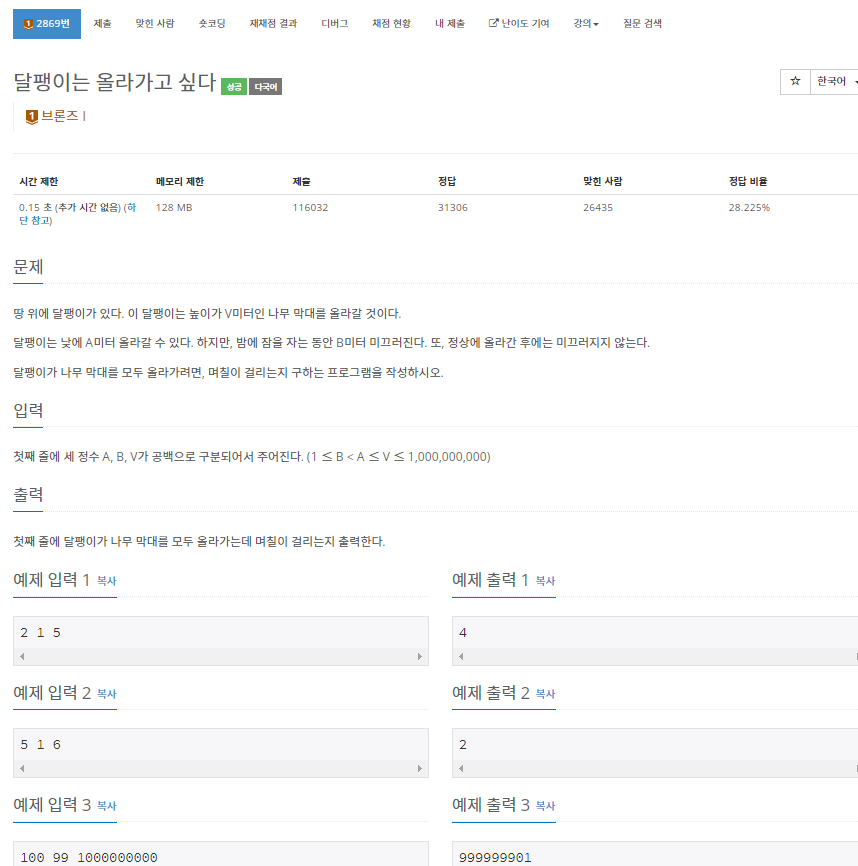 첫째 줄에 세 정수 A, B, V가 공백으로 구분되어서 주어진다. (1 ≤ B < A ≤ V ≤ 1,000,000,000)