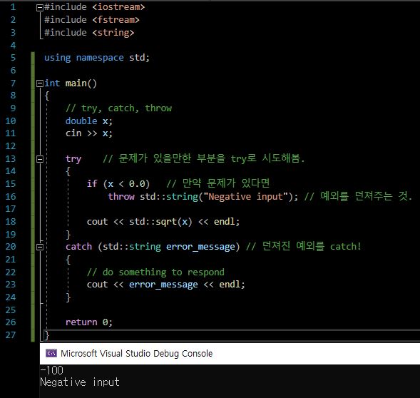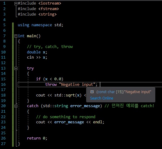 현재 throw를 하는 "Negative input"은 const char* 타입이다. std::string 타입이 아니기에