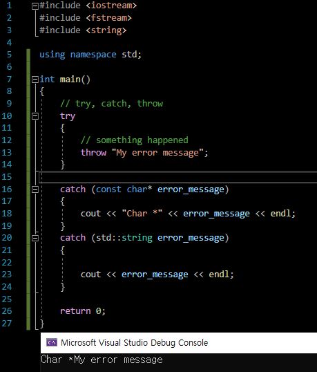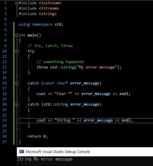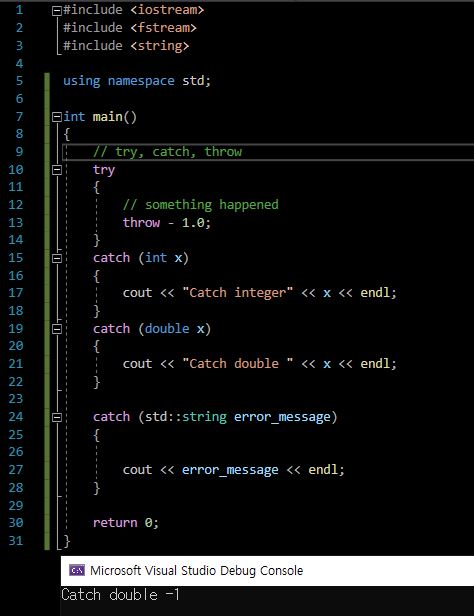 여기서 가장 중요한 건, throw에서 던져준 데이터 타입이 catch의 인자 데이터 타입과 정확히 일치해야한다는 것이다.
