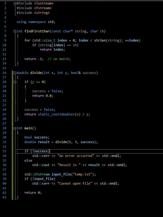 흔히 우리가 오류인 상황? 예외인 상황을 return -1로 표현을 한다거나, Flag 역할을 하는 bool 타입의 변수를 하나 선언해서 인자로 전달하는 경우를 많이 사용하게 된다. 정통적인 C++ 스타일의 코드이며, 실제로 많이 사용되는 코드이다.