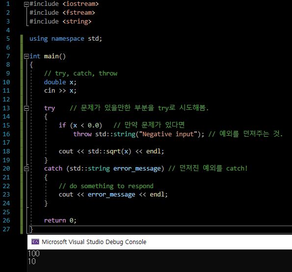 100을 x에 넣으면 우선 try가 실행되고, if문을 거치지 않고 std::sqrt(x)가 실행되고 종료된다.
