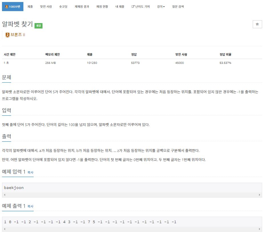 각각의 알파벳에 대해서, a가 처음 등장하는 위치, b가 처음 등장하는 위치, ... z가 처음 등장하는 위치를 공백으로 구분해서 출력한다. 만약, 어떤 알파벳이 단어에 포함되어 있지 않다면 -1을 출