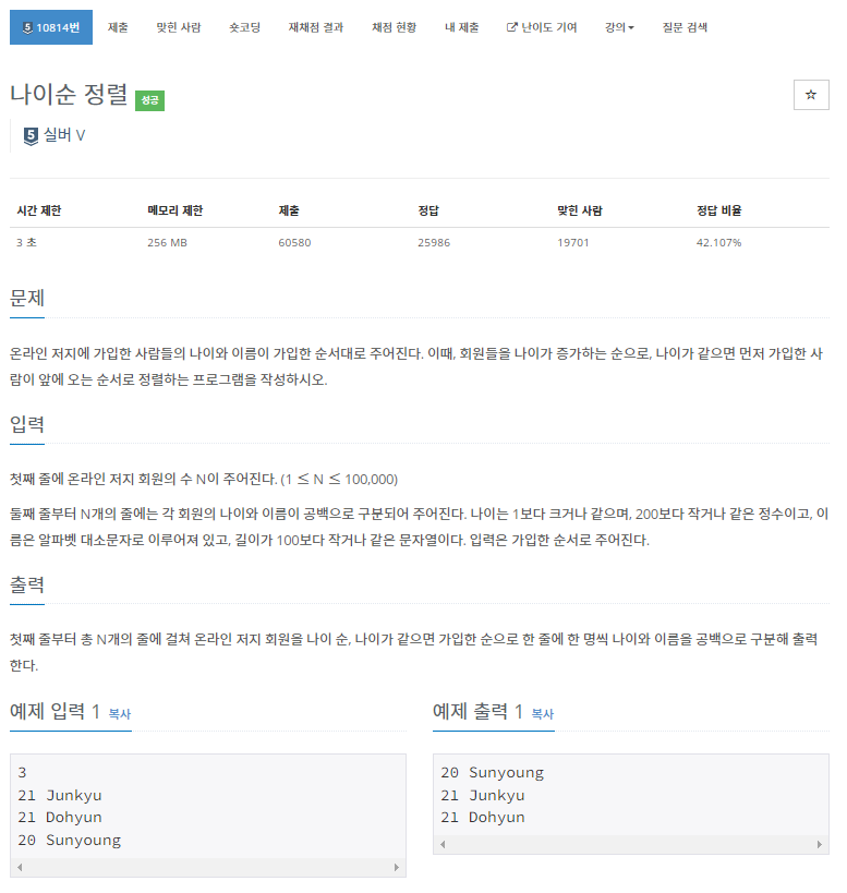 온라인 저지에 가입한 사람들의 나이와 이름이 가입한 순서대로 주어진다. 이때, 회원들을 나이가 증가하는 순으로, 나이가 같으면 먼저 가입한 사람이 앞에 오는 순서로 정렬하는 프로그램을