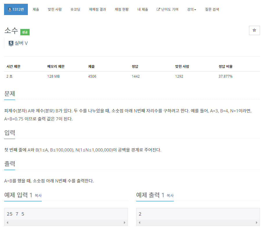 피제수(분자) A와 제수(분모) B가 있다. 두 수를 나누었을 때, 소숫점 아래 N번째 자리수를 구하려고 한다. 예를 들어, A=3, B=4, N=1이라면, A÷B=0.75 이므로 출력 값은 7이 된다.